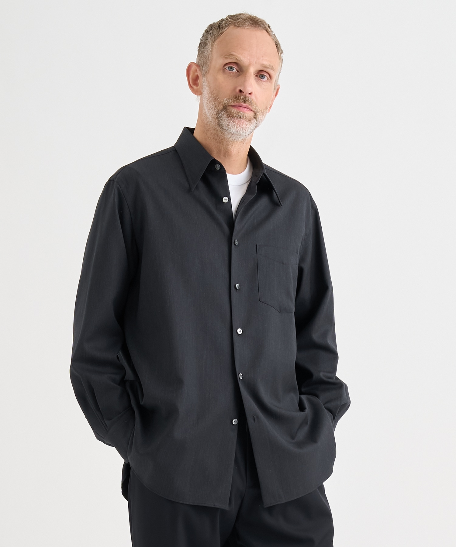 デザイン 薄手のウールギャバジン素材を使用した、着丈が長めのレギュラーカラーシャツ。 生地は尾州産地にて、ファインメリノsuper120`sのウールを使用し織られたウールギャバジン素材です。シャツもできる様な厚みの素材感で、肌当たりの良いさらっとしたタッチと品のある光沢が特徴で、シワになりにくい上質なウール素材です。手洗いが可能で、通年使える素材になっています。一見は単色の様ですが、タテヨコの糸の色味に差をつけ深みのある色に仕上げています ・裏地:なし ・伸縮性:なし ・光沢感:あり ・生地の厚さ:普通 メーカー品番:IH-25FW-B045-ND8 -IRENISA- イレニサ(IRENISA)は、小林祐と安倍悠治によるデザイナーデュオが手がける日本のメンズブランド。 イレニサのコンセプトは、CHIC WITH SARCASM。モードの基本を熟知した立体的なデザインに、クラフツマンシップを融合させた新しい衣服。そこに、常識の見え方が変わるきっかけを組み込んでいく。 既成概念に捉われない遊び心で、衣服の概念を裏切る。本当に永く付き合える衣服とは何か、未完成の完成とは何かを提案する。
