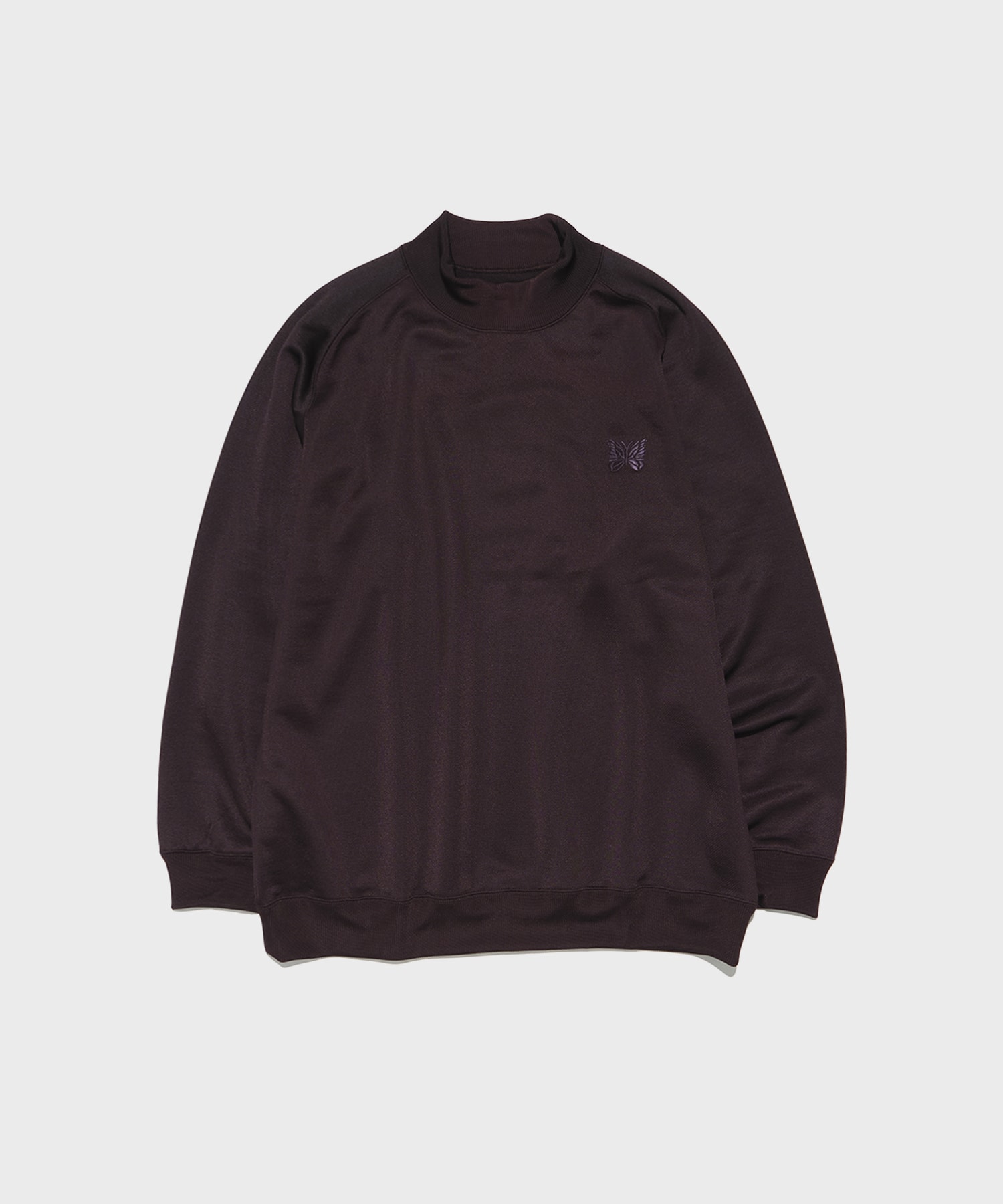 定番の光沢感のあるジャージー素材を使用したモックネックTシャツ。ワンポイントのパピヨンの刺繍がアクセントな一着。