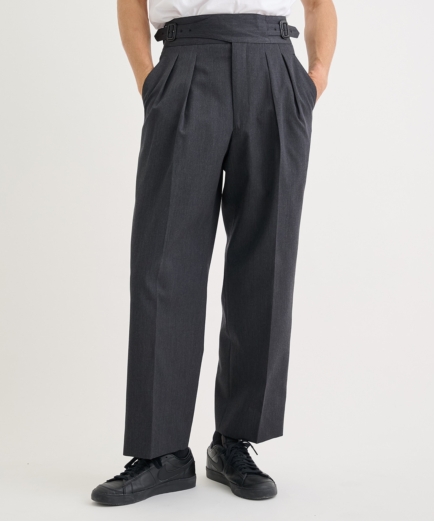 デザイン メリノウールのギャバジン素材を使用したグルカスラックス。 イギリス軍のグルカパンツをベースにTHE RERACSらしいシルエットと素材に落とし込んだデザイン。 フロントにタックを入れ、立体的な腰回りを構成しゆるやかにテーパードさせたライン。対してウエストはフィットさせ特徴的なバックルデザインをアクセントにすることで、メリハリあるシルエットに。素材のハリ感とパターン設計が合わさり、THE RERACSで長年愛されているスラックスです。 素材 ・裏地:なし ・伸縮性:なし ・光沢感:なし メーカー品番:25FW-REPT-263-J ※こちらの商品はブランド様のご意向により、ポイント付与が不可となっております。ご了承ください。 -THE RERACS- デザイナーの倉橋直実氏は、セレクトショップ勤務中にパターンメイキングやテキスタイルを学び、その後ブランド活動をスタート。 ベーシックでありながらも既成概念に捉われず、時代に合ったシルエットや素材を追求しながら、着る人に依存する、着る人を美しくするデザインを提案している。