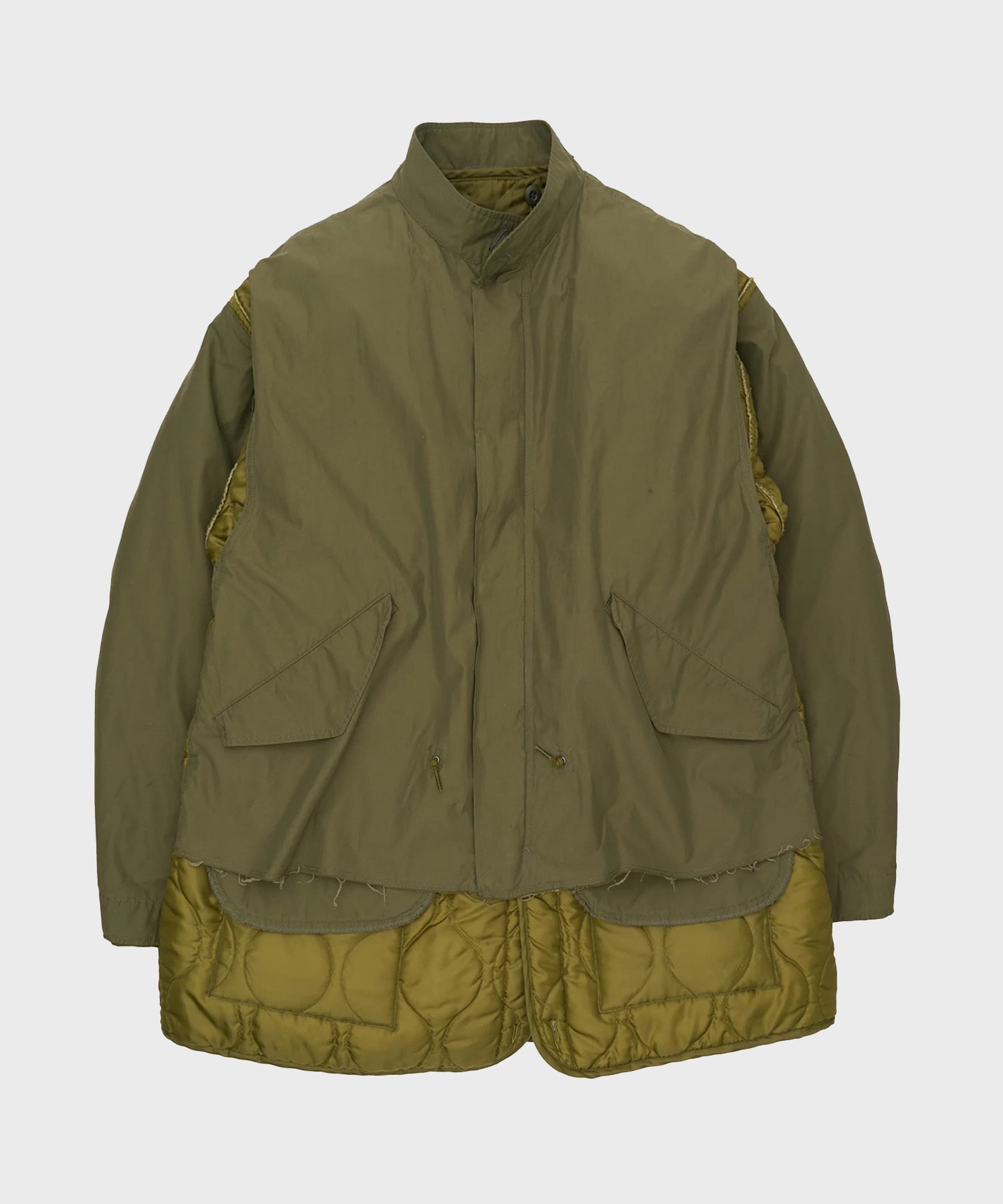 デザイン M-65 FISHTAIL PARKAとキルティングライナーが再構築されたミリタリーブルゾン。 コート丈をブルゾン丈にカットし、下からキルティングライナーがのぞく仕様に。 袖も解体し、ライナーと縫い合わせることである程度を生み、違和感を待ちました。 マン・レイのシュールレアリスムのオブジェのインスピレーションから異なるアイテムの組み合わせを構築したデザインに落とし込みました。 素材はオリジナルに忠実にM-65 FISHTAIL PARKAは撥水加工のコットンナイロンポプリン、キルティングライナーはナイロンタフタを使用して大量も入っています。 オーバーサイズ/撥水加工 素材 ・裏地:あり ・伸縮性:なし ・光沢感:なし ・生地の厚さ:普通 メーカー品番:YK25FW01023B -YOKE- ブランド名の《 YOKE/ヨーク 》は、『繋ぐ』『絆』『洋服の切り替え布』などの意味。"つなぐ" をコンセプトに2018AWにブランドをスタート。 素材やパターンにこだわり、スタンダードなアイテムにコンテンポラリーな要素をプラス。 ユニセックスで着用できる洗練されたアイテムを提案している。
