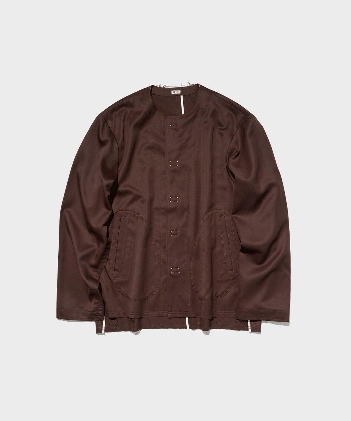 デザイン KHOKIの定番ノーカラージャケットが、上質なウールギャバジン素材を使用し、ミニマルなデザインにエッジを効かせた一着として発売。大ぶりスナップボタンや配色ステッチがアクセントで、切りっぱなしの裾や袖がラフさを演出。軽やかで上品な着こなしが叶い、セットアップも展開しています。 素材 ・裏地:なし ・伸縮性:なし ・光沢感:なし ・生地の厚さ:普通 メーカー品番:25fw-jk-10 -KHOKI- KHOKI(コッキ)は特定のデザイナーを設けず、デザインチームで構成し、活動している匿名性の高い新感覚のブランド。 特定のデザイナーを設けないことへのメリットとして、先入観をなくし、アイテム一つ一つの本当の意味での価値を見出す。