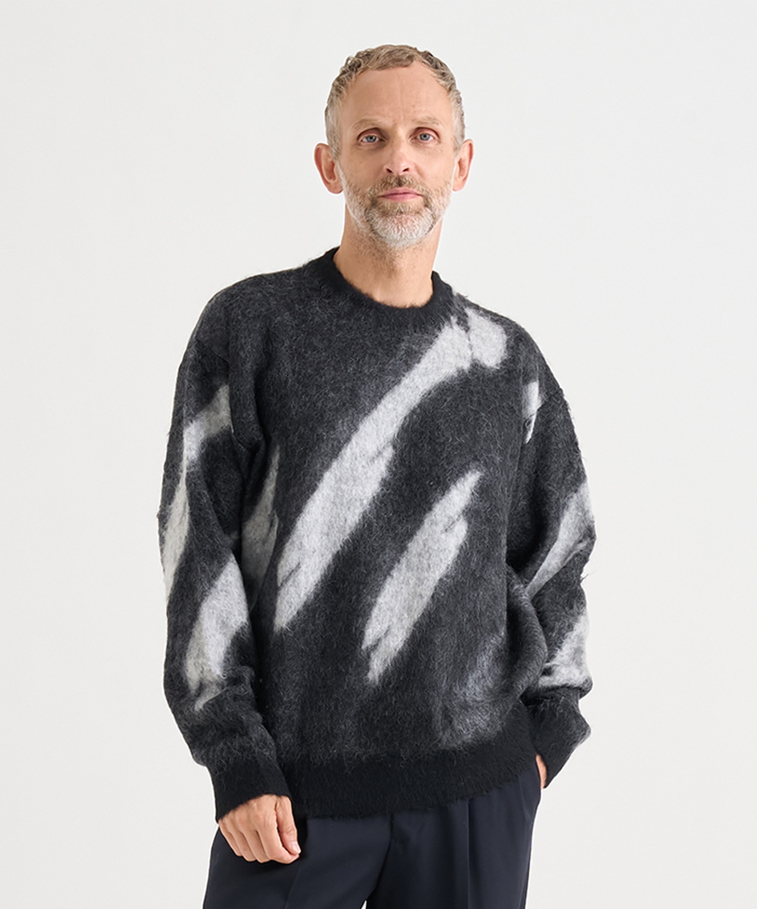 デザイン 毎シーズン展開しているジャガードモヘアセーター。 今シーズンはマン・レイの1920年代に製作された映像作品の一瞬を切り出したような抽象的なグラフィックをモノトーンでセーターに落とし込みました。 細くしなやかで光沢感のあるスーパーキッドモヘアを主原料に毛足のあるタムタムヤーンを使用。 ボリューム感と保温力を抑えたニットです。 ワイドフィット/モヘアセーター 素材 ・裏地:なし ・伸縮性:あり ・光沢感:なし ・生地の厚さ:普通 メーカー品番:YK25FW01110S -YOKE- ブランド名の《 YOKE/ヨーク 》は、『繋ぐ』『絆』『洋服の切り替え布』などの意味。"つなぐ" をコンセプトに2018AWにブランドをスタート。 素材やパターンにこだわり、スタンダードなアイテムにコンテンポラリーな要素をプラス。 ユニセックスで着用できる洗練されたアイテムを提案している。