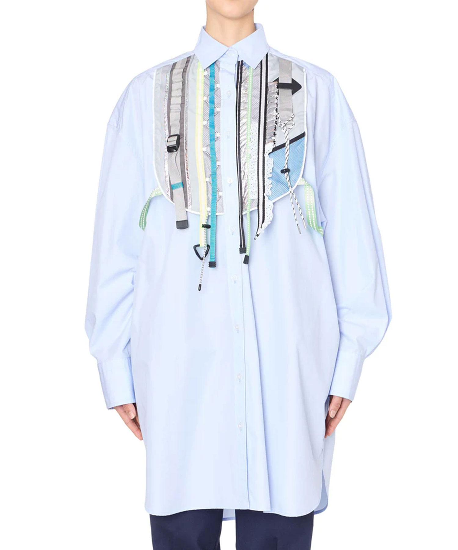 デザインkolorならではの実験的なデザインが際立つシャツワンピース。ベースはシンプルなブラックシャツでありながら、フロント上部に配された テープ、メッシュ、コード、バックルなどの異素材装飾 が、立体感と奥行きを生み出しています。素材透け感:なし伸縮性:なし裏地:なしメーカー品番:26SCL-B03114-kolor-デザイナーの阿部潤一は1965年生まれ。 文化服装学院アパレルデザイン科でファッションを学ぶ。卒業後、いくつかのアパレルメーカーを経て、2004年、独立し、自身のブランド「kolor(カラー)」を設立。2005S/Sからコレクションをスタート。パターン、素材、縫製のバランスにこだわった、時代の気分にフィットするデザインが人気で、阿部氏が手掛ける独創的な色使いと斬新な素材の開発への評価は高い。2012-13A/Wコレクションよりパリ・メンズファッションウィークでコレクションを発表している。2012年「第30回毎日ファッション大賞」大賞受賞。