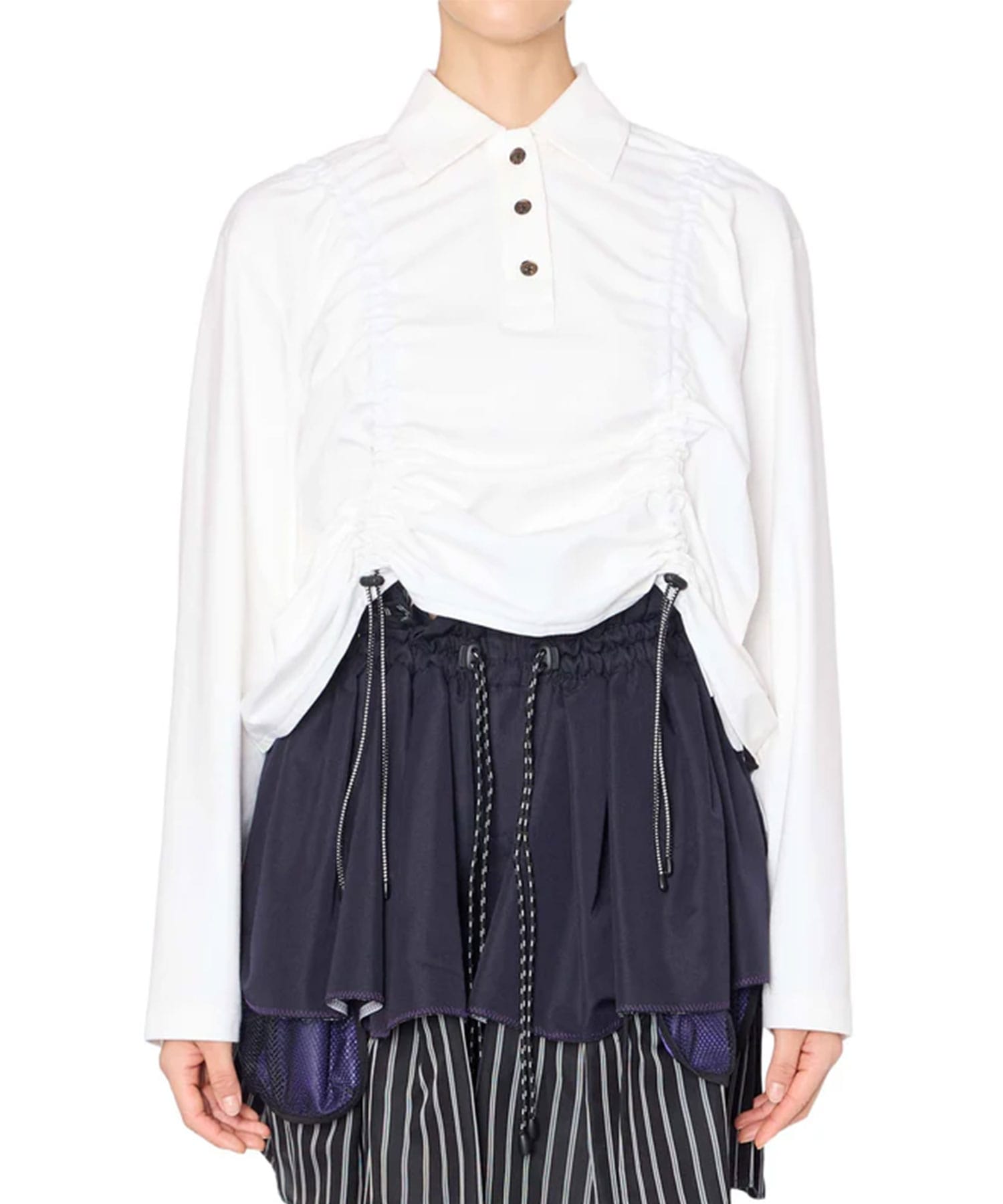 身頃の両サイドに施されたシャーリングとドローストリングによって、シルエットの調整が可能で、着こなしに動きと表情をプラスします。
