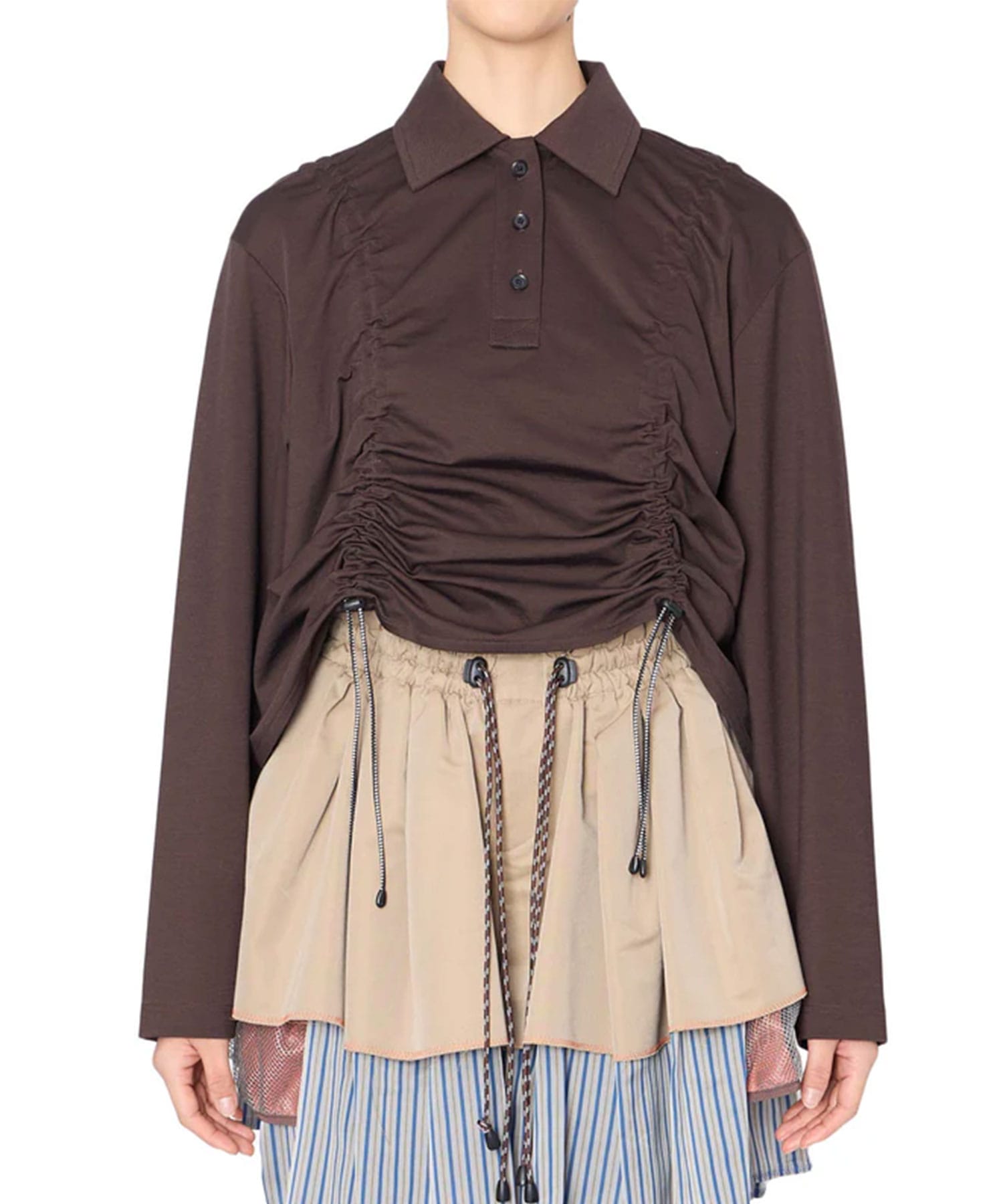 デザイン立体的なギャザーが印象的なデザインブラウス。身頃の両サイドに施されたシャーリングとドローストリングによって、シルエットの調整が可能で、着こなしに動きと表情をプラスします。フロントはポロシャツ風の襟とボタン仕様で、きちんと感がありながらもモードな雰囲気に。素材透け感:なし伸縮性:なし裏地:なしメーカー品番:26SCL-T08203-kolor-デザイナーの阿部潤一は1965年生まれ。 文化服装学院アパレルデザイン科でファッションを学ぶ。卒業後、いくつかのアパレルメーカーを経て、2004年、独立し、自身のブランド「kolor(カラー)」を設立。2005S/Sからコレクションをスタート。パターン、素材、縫製のバランスにこだわった、時代の気分にフィットするデザインが人気で、阿部氏が手掛ける独創的な色使いと斬新な素材の開発への評価は高い。2012-13A/Wコレクションよりパリ・メンズファッションウィークでコレクションを発表している。2012年「第30回毎日ファッション大賞」大賞受賞。