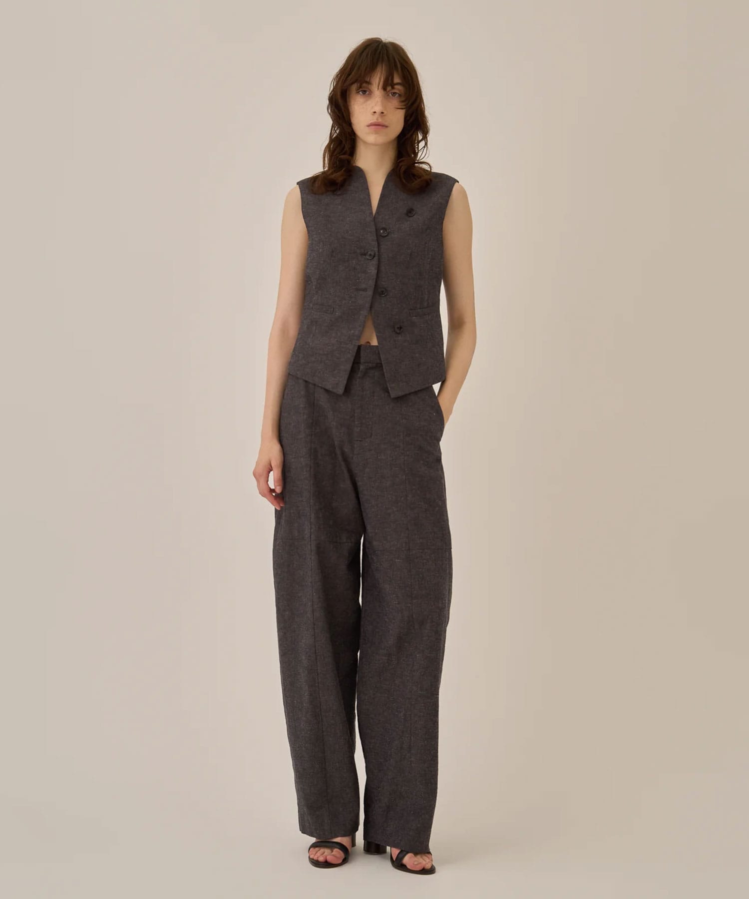 同素材のベストと合わせてセットアップとしてコーディネートすることでも、今季らしいエスプリの効いたスタイルを作り上げることができます。