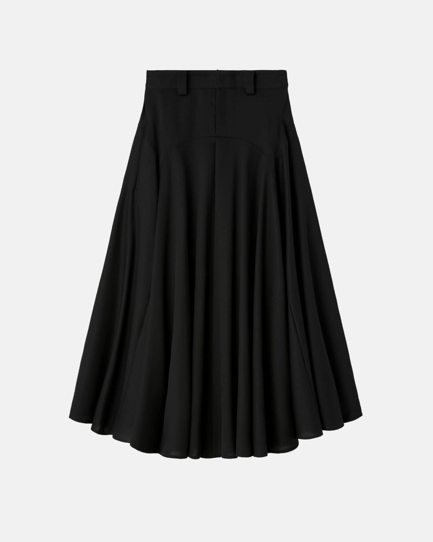 ウール100%の上質な素材を贅沢に使用し、豊かなドレープと分量感のあるシルエットを実現。 動きに合わせて波打つように広がるフレアが、ミニマルな構成の中にエレガントな表情を添えます。