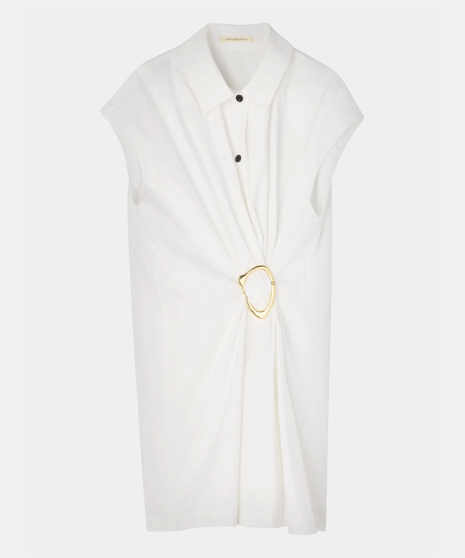 デザインHARUNOBUMURATA2026年春夏コレクションより、アイコニックなバックルを配したスリーブレスシャツ。 Super100’sファインメリノウールのトロピカルにソトー仕上げを施した生地は、クリアで高級感のある表情と、しなやかな落ち感を兼ね備えています。 不規則に生まれるドレープが、構築的なフォルムの中に軽やかさと女性らしい美しさを際立たせ、静かな陰影を描き出します。フロントに配されたゴールドバックルが、ミニマルなデザインに凛としたアクセントを添え、装いに奥行きをもたらす存在。 一枚での着用はもちろん、ジャケットとのレイヤードにも映える、シーズンを越えて活躍する一着です。 常から特別なシーンまで、装いに奥行きと緊張感をもたらす、タイムレスな一着です。素材透け感;なし伸縮性:なし裏地:なしメーカー品番:HM26S757-TAK05-HARUNOBUMURATA-Luxury of Silence をコンセプトに、デザイナーが長い時間を過ごしたイタリアと日本から集められた上質なファブリックと高いドレーピング技術が組み合わされたコレクションを展開。日本初のラグジュアリーブランドの確立をミッションに掲げ、2019 年秋冬ミラノコレクションにてイタリアファッション協会の支援デザイナーとしてデビューコレクションを発表。2021年TOKYO FASHION AWARD 受賞。