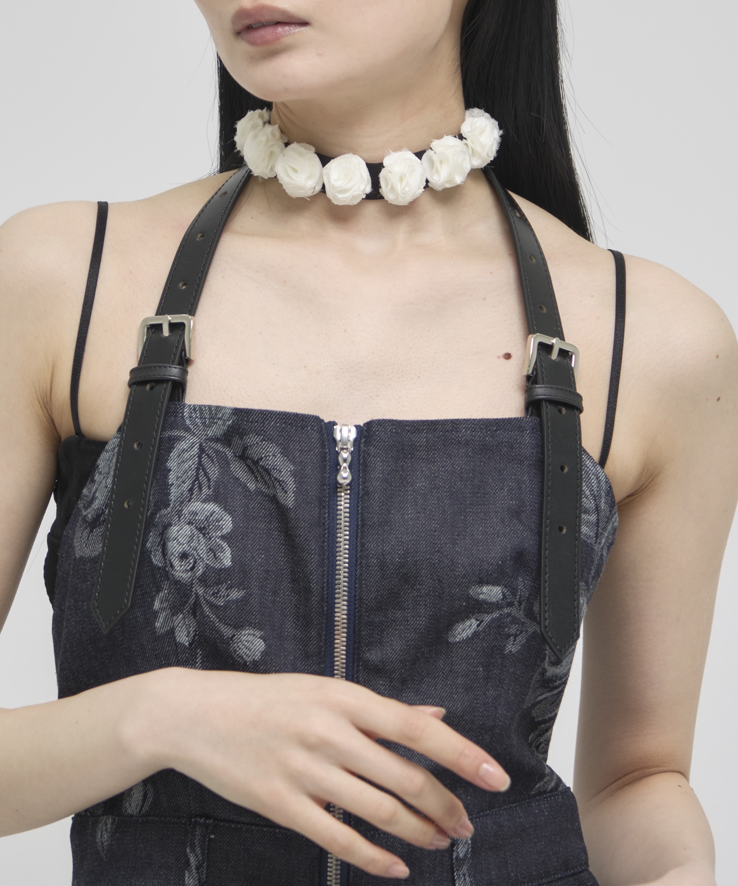デザイン薔薇モチーフチョーカー。ヘアバンドとしても使用可能です。モチーフはひとつひとつ職?によるハンドメイドとなっています。メーカー品番:FTC252-2007-FETICO-FETICO(フェティコ)は元クリスチャン・ダダのウィンズデザイナー舟山瑛美と、同ブランドのパタンナー・高浜温子の2人で設立。ブランド名は、デザイナーを務める舟山瑛美のニックネームから名付けられている。ブランドの着想源となるのは、女性の造形美を強調するスタイル。女性の美意識や身体観を独自の視点で再構築し、様々な要素を組み合わせながらユニークで新しい女性像を提案する。ラインナップするアイテムは、透け感や光沢のある素材を用い、女性の体のラインを美しく見せるシルエットに仕立てている。日本国内で生産されているのも特徴で、素材だけでなく縫製のクオリティの高さもブランドの強みとなっている。