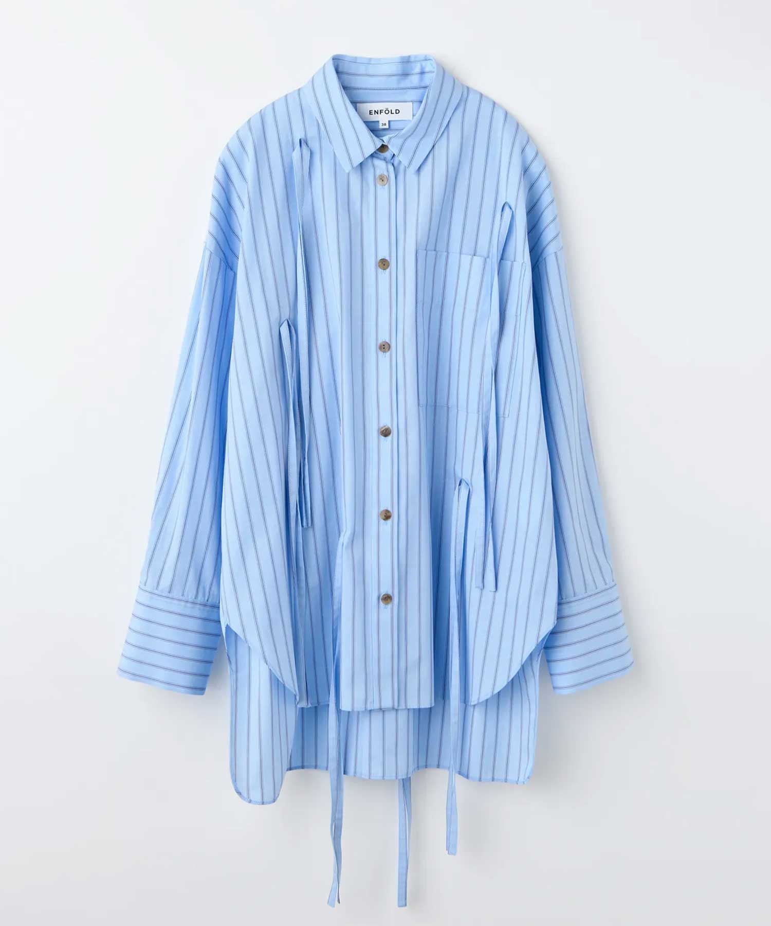 デザインリボンをあしらった華やかなデザインシャツ。フリンジのようにリボンを垂らして着用するのは勿論、1つ1つをリボン結びしてリボンが散らばっているように着たり、別々のリボン同士を結んで1新たなドレープを作るなど着る人によって楽しみ方が広がる1着です。少し大きめのサイズ設定で、サッと羽織感覚で着用するのもオススメです。素材-60/1コンパクト糸を使用。タイプライタ-の生地に、液アン加工を施す事で、生地に膨らみを加えています。透け感:なし伸縮性:なし裏地:なしメーカー品番:300IA730-1701-ENFOLD-「内面の美しさを映し出す服」をコンセプトに、2012年にデザイナー植田みずき氏がスタート。身体を包み込むようなシルエットと構築的なフォルムで、モードとコンフォートを両立。本質を大切にする女性に向けた、タイムレスなスタイルを提案する。