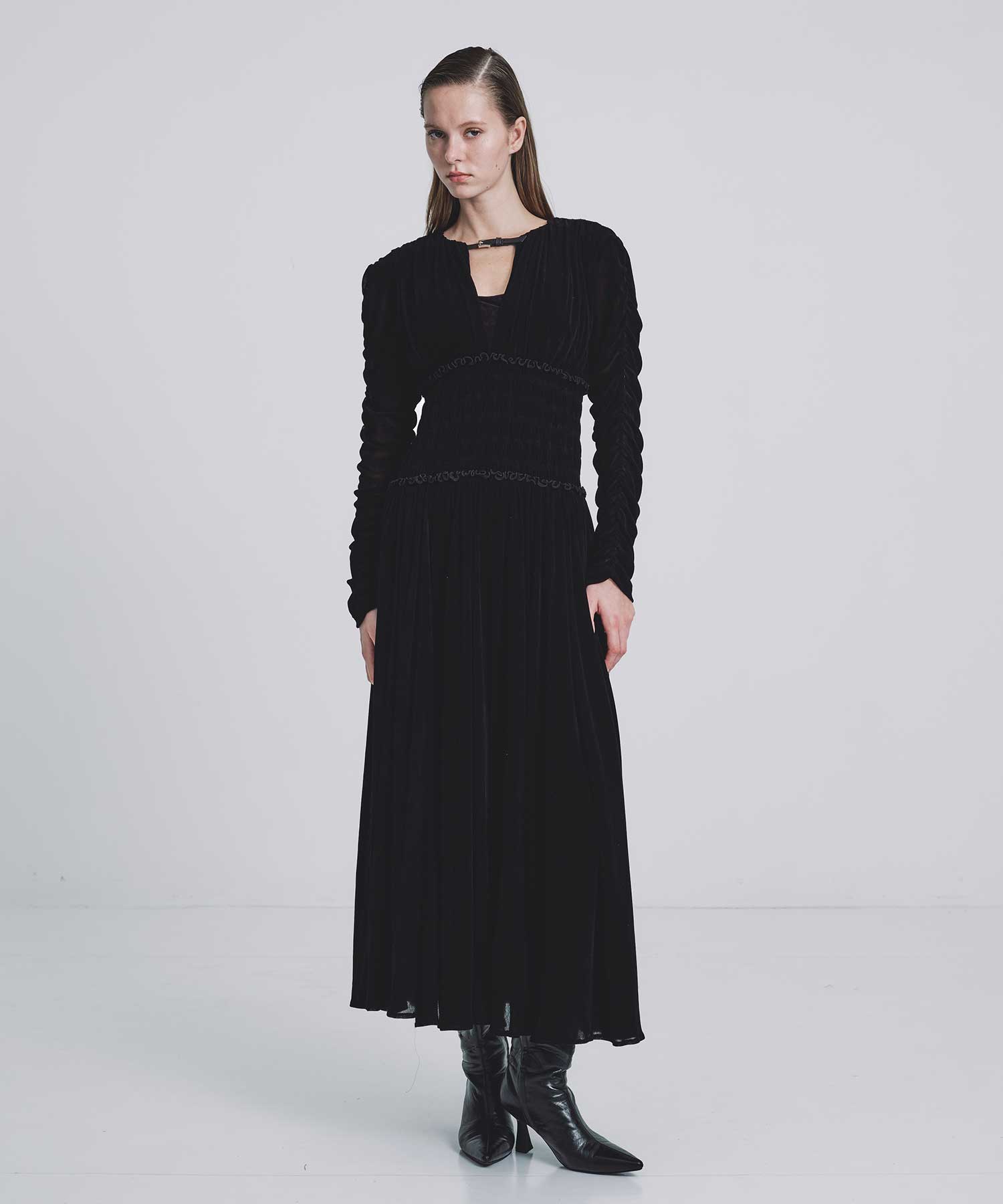 デザインシャーリングとギャザーディテールがFETICOらしいドレスが登場。チュールにフロッキー加工を施したシャーリングドレス。ストレッチ性のあるベロア風の素材は、袖を通すだけでその着心地の良さを感じます。首元のレザーベルトで程よいアクセントとなり、アクセサリーいらずで華やかな印象を与えます。素材透け感:ややあり伸縮性:あり裏地:ありドライクリーニング推奨メーカー品番:FTC254-0808A-FETICO-FETICO(フェティコ)は元クリスチャン・ダダのウィンズデザイナー舟山瑛美と、同ブランドのパタンナー・高浜温子の2人で設立。ブランド名は、デザイナーを務める舟山瑛美のニックネームから名付けられている。ブランドの着想源となるのは、女性の造形美を強調するスタイル。女性の美意識や身体観を独自の視点で再構築し、様々な要素を組み合わせながらユニークで新しい女性像を提案する。ラインナップするアイテムは、透け感や光沢のある素材を用い、女性の体のラインを美しく見せるシルエットに仕立てている。日本国内で生産されているのも特徴で、素材だけでなく縫製のクオリティの高さもブランドの強みとなっている。