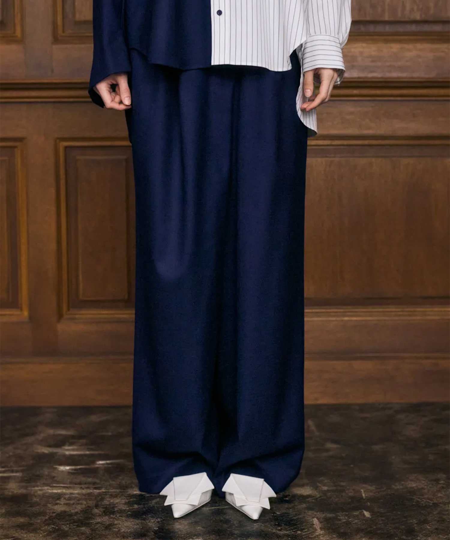 デザインワイドなリラックスしたデザインのトラウザー。使い勝手の良いワイドストレート型で、ズレているウエストディティールがポイントです。素材2/60の綾織りでストレッチが入っている。規格自体も甘くもなく、高密度というわけでもなくちょうどいい密度で表面がきれいな素材。透け感:なし伸縮性:あり裏地:ありメーカー品番:300IA431-1631-ENFOLD-「内面の美しさを映し出す服」をコンセプトに、2012年にデザイナー植田みずき氏がスタート。身体を包み込むようなシルエットと構築的なフォルムで、モードとコンフォートを両立。本質を大切にする女性に向けた、タイムレスなスタイルを提案する。