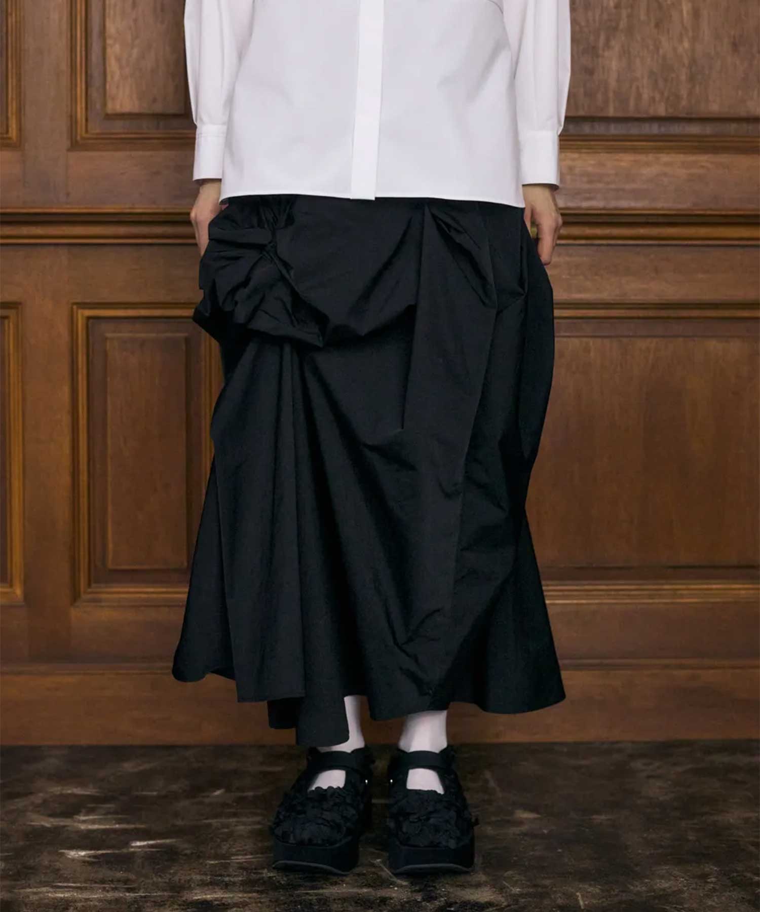 デザイン分量をたっぷり使用したリボンを思わすタックディティールのスカート。単純なリボンではなくフレアシルエットに紛れるような施し方で、サイドから流れるフレア感によりどの角度からも美しく見えるように仕上げています。素材SOLOTEXの発色性で高級感を持たせながら、緯糸にストレッチ性の糸を使用することで、キックバック性と適度な膨らみがあり、着心地の良さが特徴です。SOLOTEXにより、快適な着心地や使い心地が生み出されます。透け感:なし伸縮性:なし裏地:なしメーカー品番:300IA531-1591-ENFOLD-「内面の美しさを映し出す服」をコンセプトに、2012年にデザイナー植田みずき氏がスタート。身体を包み込むようなシルエットと構築的なフォルムで、モードとコンフォートを両立。本質を大切にする女性に向けた、タイムレスなスタイルを提案する。