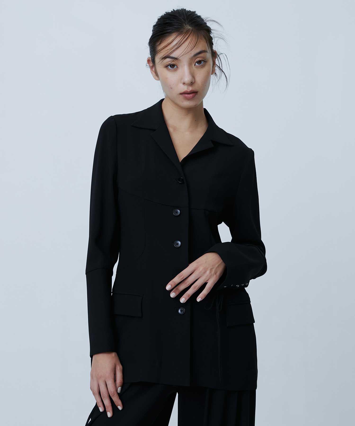 デザインシルクのような膨らみと上品な光沢感がエレガントなシャツジャケット。シワになりにくく、吸水速乾・紫外線防止などの機能性に優れた素材。袖のレースアップデザインと肩のギャザーディテールがエレガントな一着。素材透け感:なし伸縮性:なし裏地:ありドライクリーニング推奨メーカー品番:FTC254-0208-FETICO-FETICO(フェティコ)は元クリスチャン・ダダのウィンズデザイナー舟山瑛美と、同ブランドのパタンナー・高浜温子の2人で設立。ブランド名は、デザイナーを務める舟山瑛美のニックネームから名付けられている。ブランドの着想源となるのは、女性の造形美を強調するスタイル。女性の美意識や身体観を独自の視点で再構築し、様々な要素を組み合わせながらユニークで新しい女性像を提案する。ラインナップするアイテムは、透け感や光沢のある素材を用い、女性の体のラインを美しく見せるシルエットに仕立てている。日本国内で生産されているのも特徴で、素材だけでなく縫製のクオリティの高さもブランドの強みとなっている。