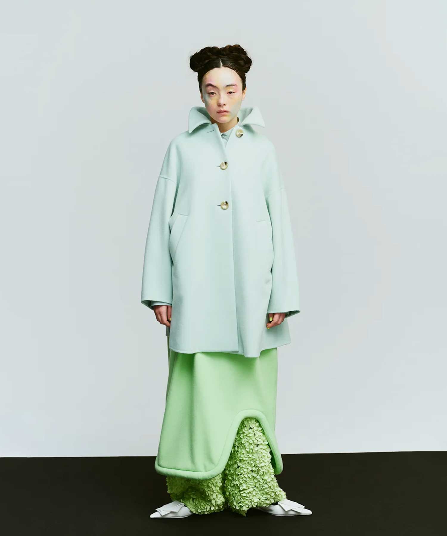 デザイン着物の抜き衿をイメージした”うなじ”を見せる、首を後ろに抜いて着るタイプのユニークなパターンで作られたコート。スタンダードなステンカラーのクラシックなデザインのコートでありながら、首元に抜け感を出しやすく新しいスタイリングバランスになります。後ろに抜かずに前を閉めてフロントドレープコートとして新しいバランスで着用できます。素材ニュージーランドのキウイラムの糸を使用したダブルフェイス素材。繊維張の密度が細かく糸に膨らみがあることからしなやかな風合いを表現しています。一般的な牧場の羊毛より極めて優れた白度の羊毛のため彩度良く色がでます。シャルムビーバー仕上げにより光沢感が増して高級感のある表情をしています。透け感:なし伸縮性:なし裏地:ありメーカー品番:300IA480-1941-ENFOLD-「内面の美しさを映し出す服」をコンセプトに、2012年にデザイナー植田みずき氏がスタート。身体を包み込むようなシルエットと構築的なフォルムで、モードとコンフォートを両立。本質を大切にする女性に向けた、タイムレスなスタイルを提案する。