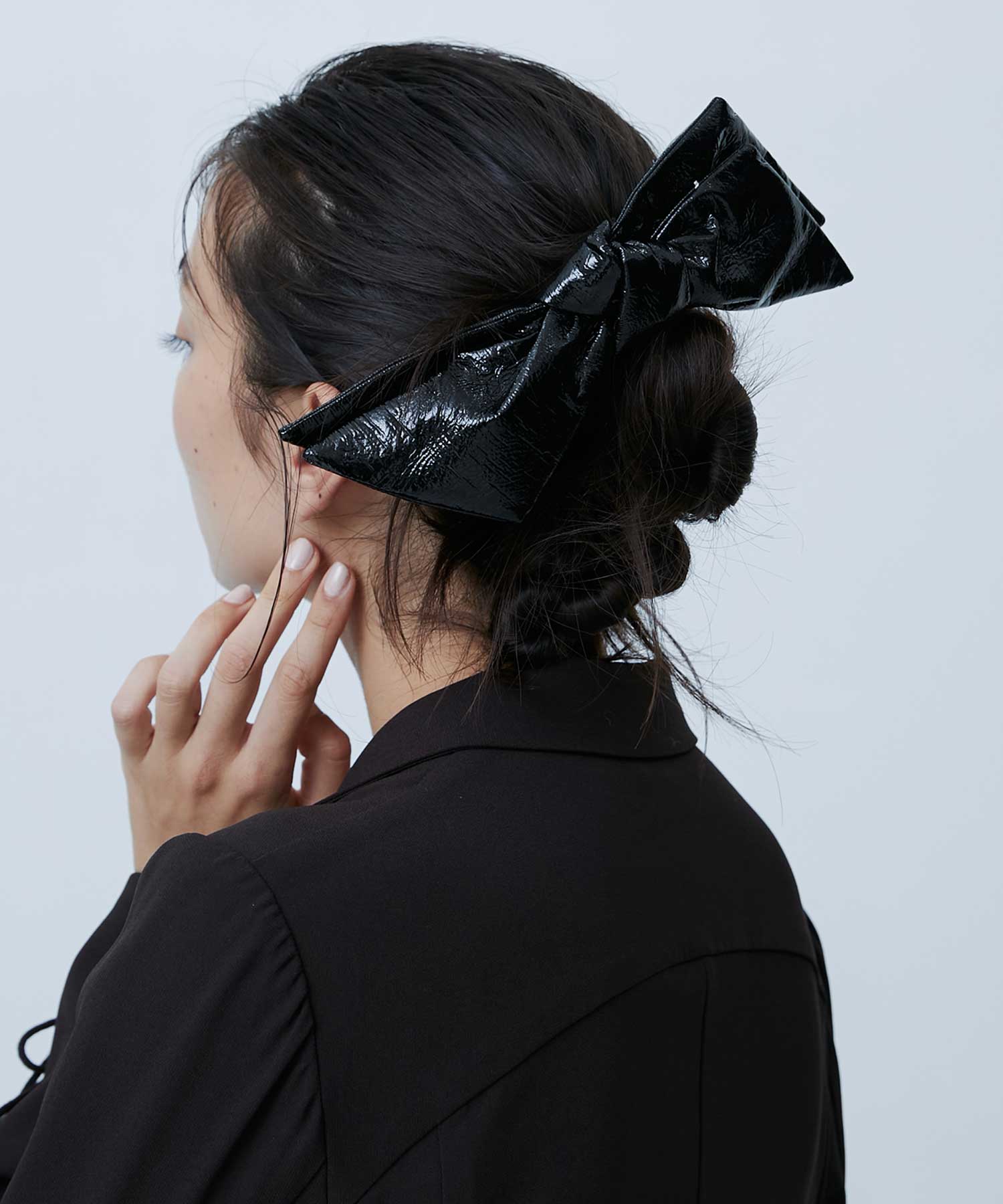 デザインフェイクレザーリボンヘアクリップ。存在感あふれるヘアアクセサリー。メーカー品番:FTC254-2001B-FETICO-FETICO(フェティコ)は元クリスチャン・ダダのウィンズデザイナー舟山瑛美と、同ブランドのパタンナー・高浜温子の2人で設立。ブランド名は、デザイナーを務める舟山瑛美のニックネームから名付けられている。ブランドの着想源となるのは、女性の造形美を強調するスタイル。女性の美意識や身体観を独自の視点で再構築し、様々な要素を組み合わせながらユニークで新しい女性像を提案する。ラインナップするアイテムは、透け感や光沢のある素材を用い、女性の体のラインを美しく見せるシルエットに仕立てている。日本国内で生産されているのも特徴で、素材だけでなく縫製のクオリティの高さもブランドの強みとなっている。