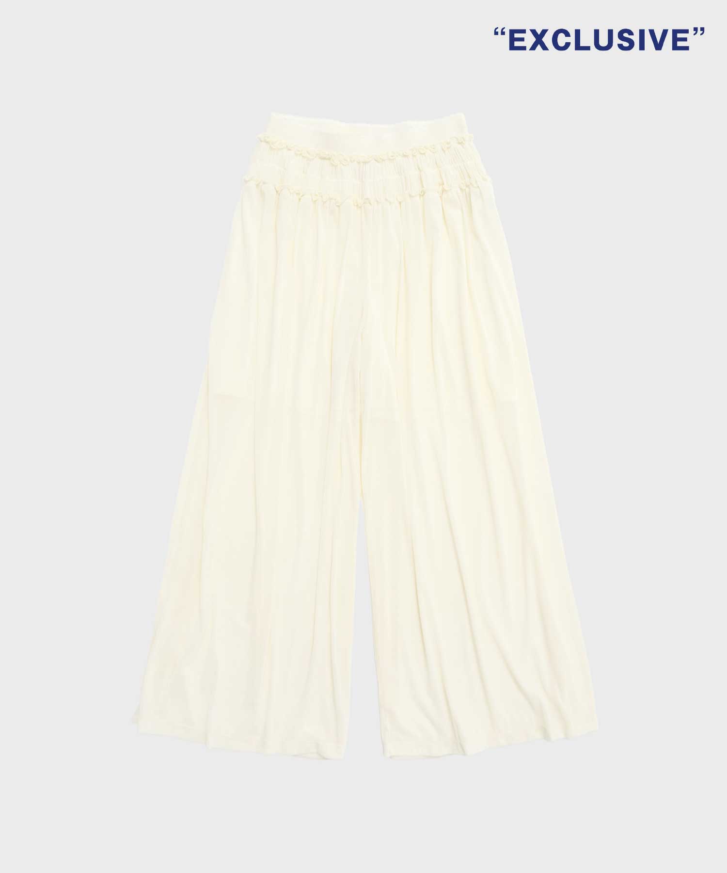FETICO for THE TOKYOデザイン25AWに登場した「Velvet tulle shirring dress」のストレッチ性のあるベロア風素材を使用した、ボディスーツとワイドパンツの2型を展開。ワイドパンツはウエストゴムにブランドロゴの刺繍を施し、締め付け感なく着用いただけます。セットアップでの着用はもちろん、単品でもその存在感を放つアイテム。袖を通すだけで感じられる着心地の良さと、ふんだんに散りばめられたギャザーディテールが美しいアイテムです。素材透け感:一部あり伸縮性:あり裏地:ありドライクリーニング推奨メーカー品番:32FT0FTC254-0421-FETICO-Designer 舟山瑛美(Emi Funayama)Brand Concept 「The Figure:Feminine(その姿、女性的)」フェティコ(FETICO)のインスピレースオンは女性の造形美を強調する古典的なスタイルにあります。その美意識や身体観を独自の視点で再構築し、相反する要素を重ね合わせながらユニークで新しい女性の姿をデザインしています。フェティコのコレクションは日本国内の繊維産地や職人との取り組みで丁寧に生産されています。時を経て美しいビンテージウェアとして愛されるようなデザイン、物作りを心がけています。
