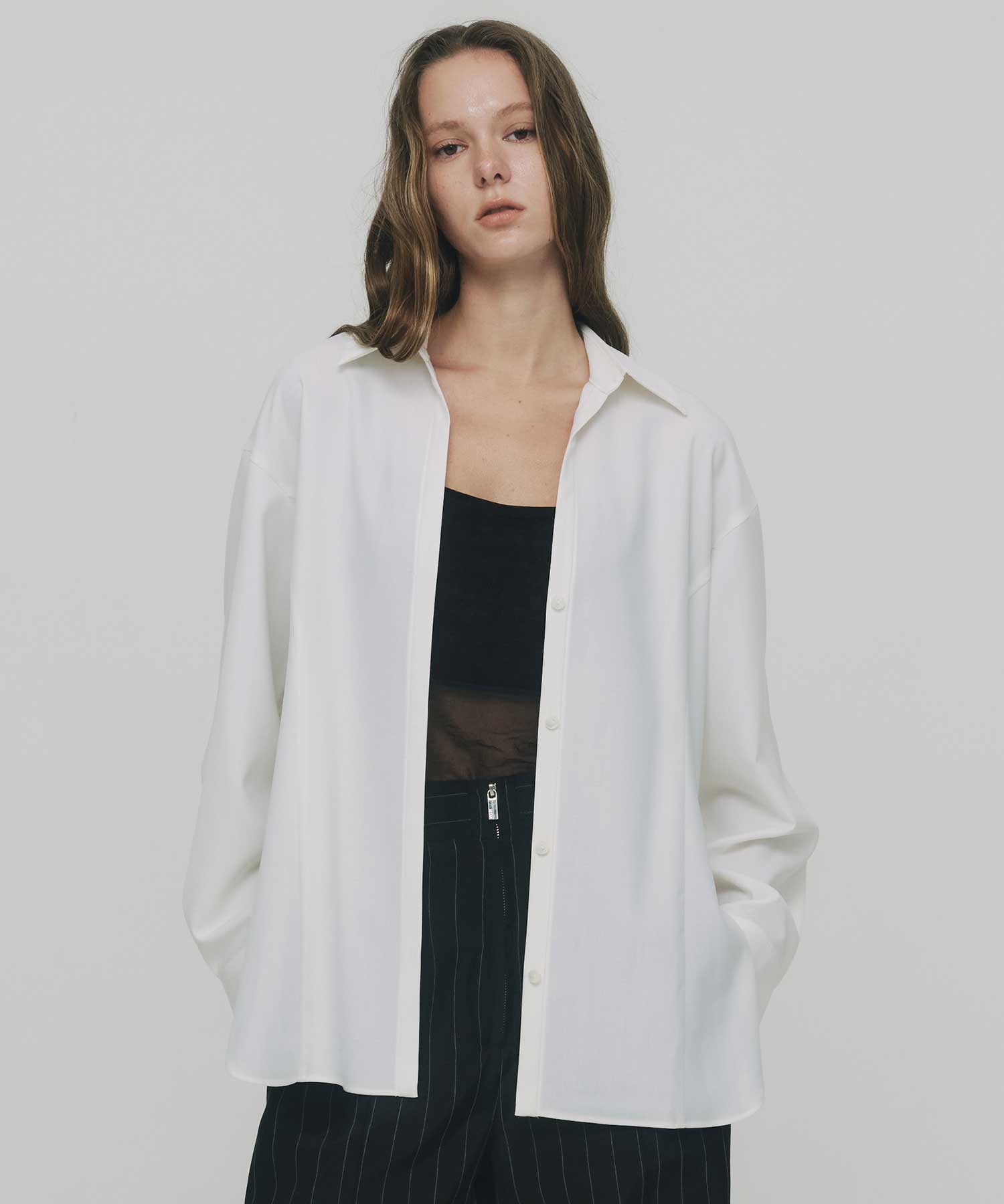 中からシアー素材が覗くこだわりのバックスリットデザインで、後ろのボタンを空けてあえてシアーを見せる着方もおすすめです。